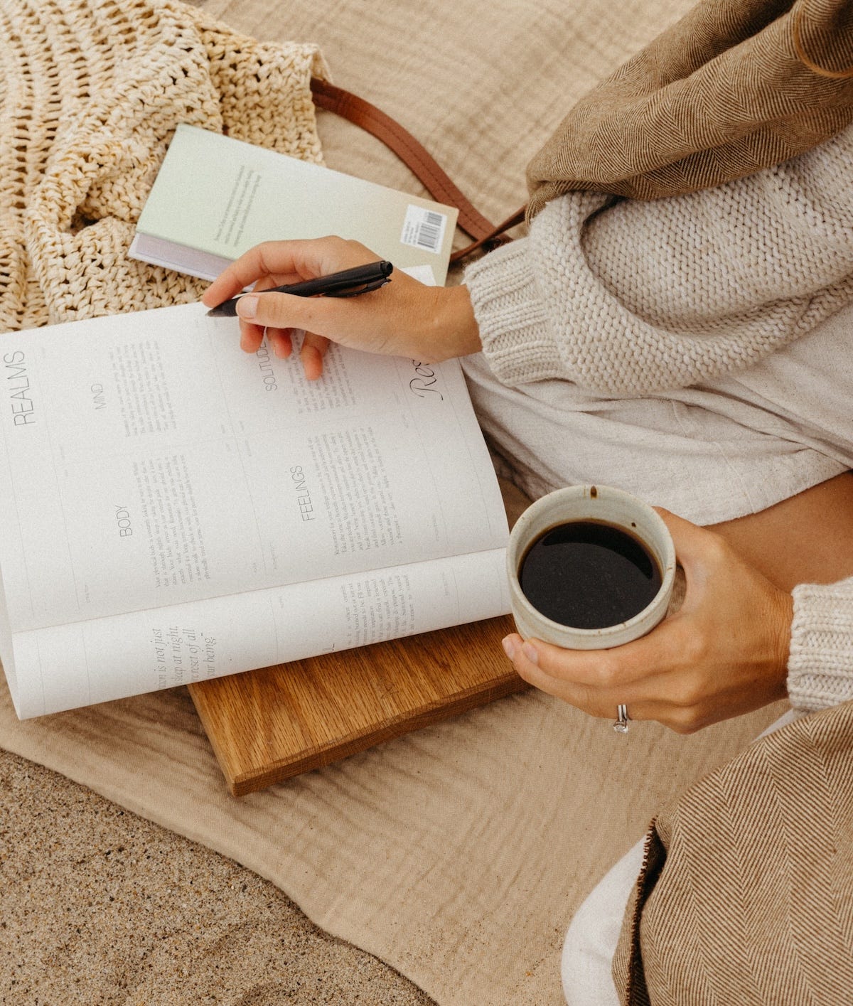 Create a ritual that feels grounding: I love doing these practices first thing in the morning when my mind is most quiet. But choose what works for you—a lunch break or cozy evening is great, too. And create a little ritual around it! I light a candle, pour my coffee, and get really comfy, so it’s something I truly look forward to each day.